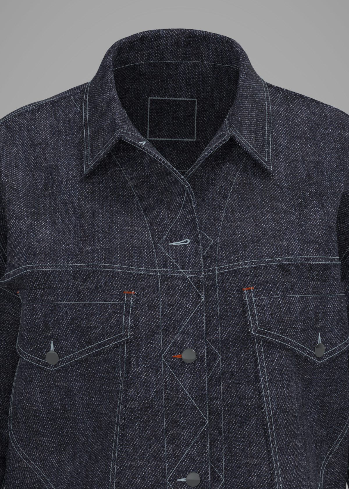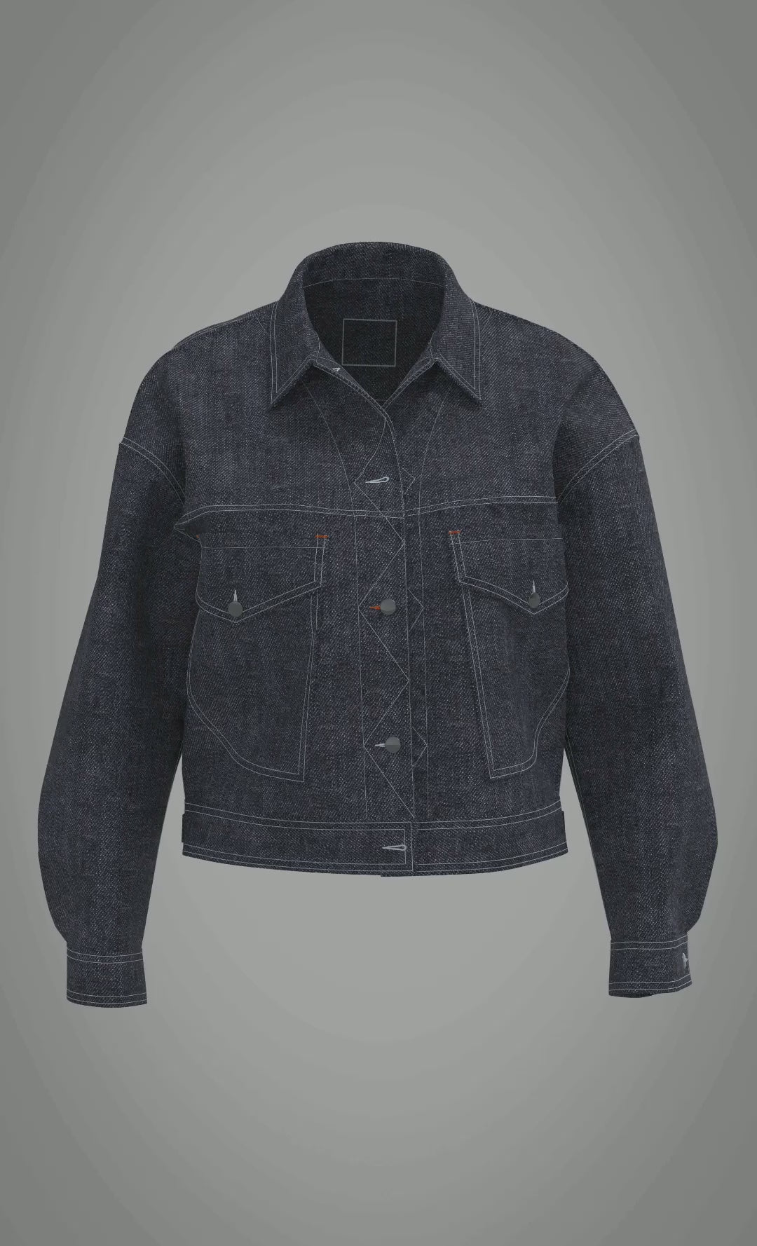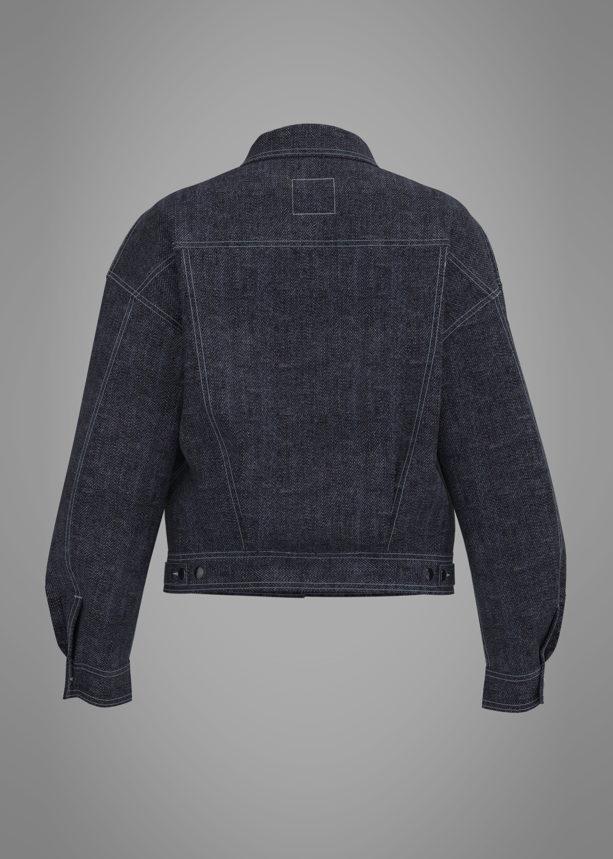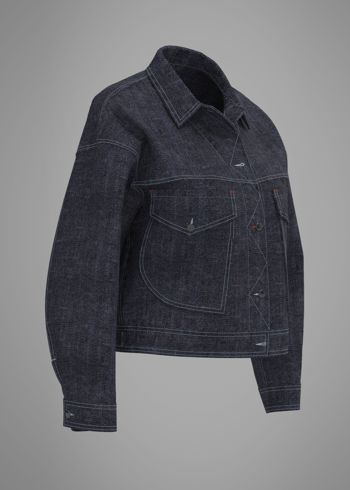 This Denim Jacket is a Ready-to-Go Pattern and a must-have for any brand's collection. It features an oversized fit with a cropped length, deep front pockets, flap pockets at the chest, and a suggested classic shank button closure. The back is enhanced by folded pleats gathered at the waistband, adding volume and a stylish touch.